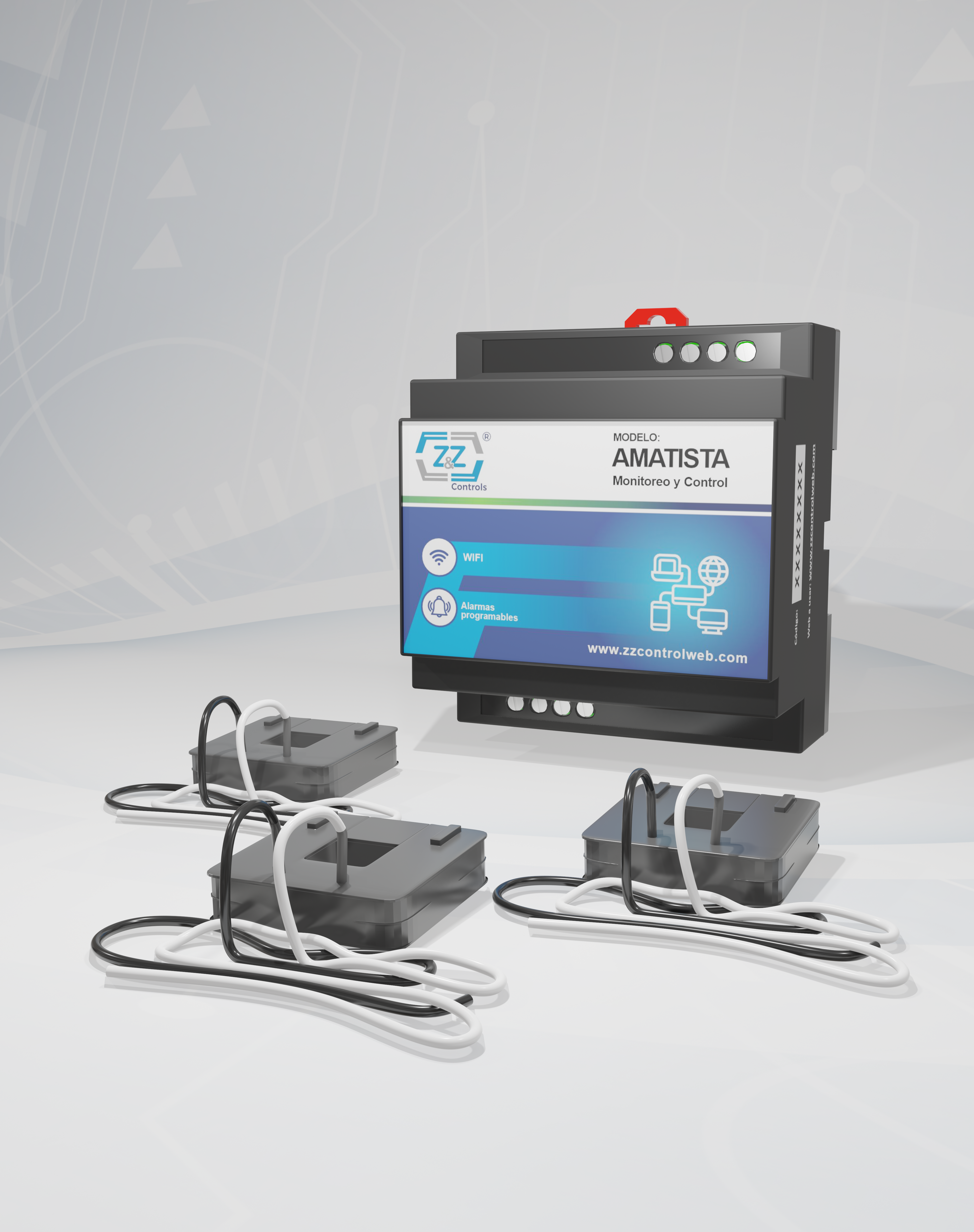 Sistema de monitoreo y control, mide 8 variables Realiza control sobre todo el ciclo de refrigeración logrando manejar el encendido y apagado del compresor, ventilador y ciclos de descongelamiento. Es supervisor de voltaje y de intensidad de corriente (protector térmico) pudiendo proteger el equipo ante una eventualidad, y restaurar automáticamente el sistema al volver los parámetros de voltaje y corriente a la normalidad. En su plataforma web, se pueden ver además de todos estos parámetros, el Consumo Energético y la Potencia. Genera alertas de todas las variables medidas, recibidas vía correo electrónico y mensaje de texto. Parámetros de medición: Humedad relativa de 0-99%. Voltaje en un rango de 80 V a 300 V AC (Alimentación Multivoltaje). Amperaje hasta un máximo de 300 A. Rango de temperatura es de -30°C hasta 120°C. 6 Entradas de Sensores. 3 Salidas de relé de control.
